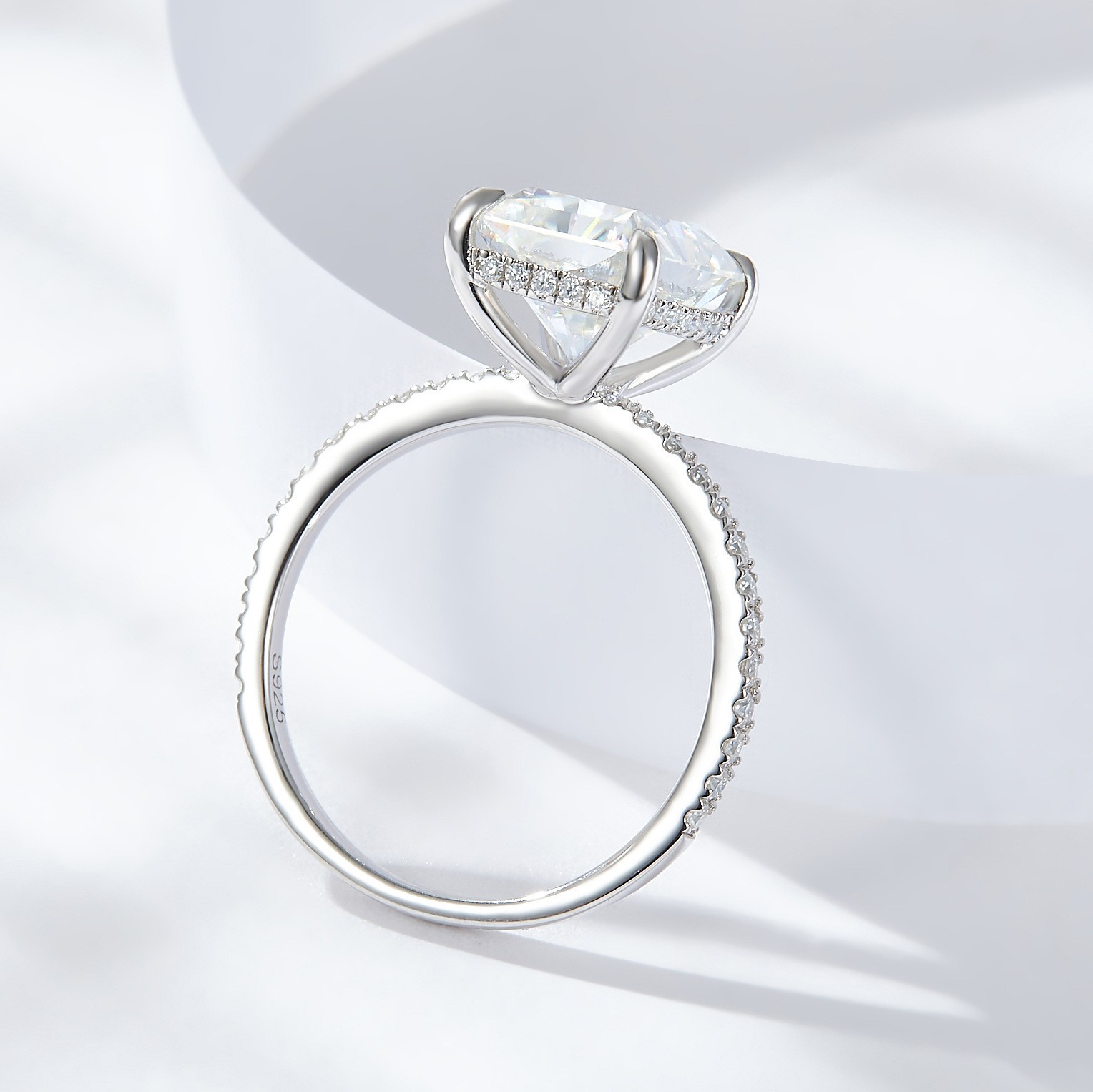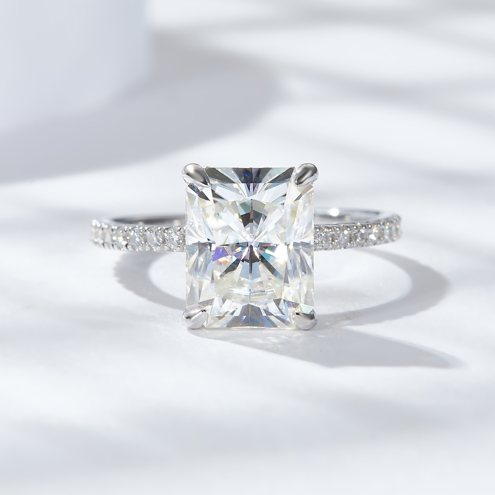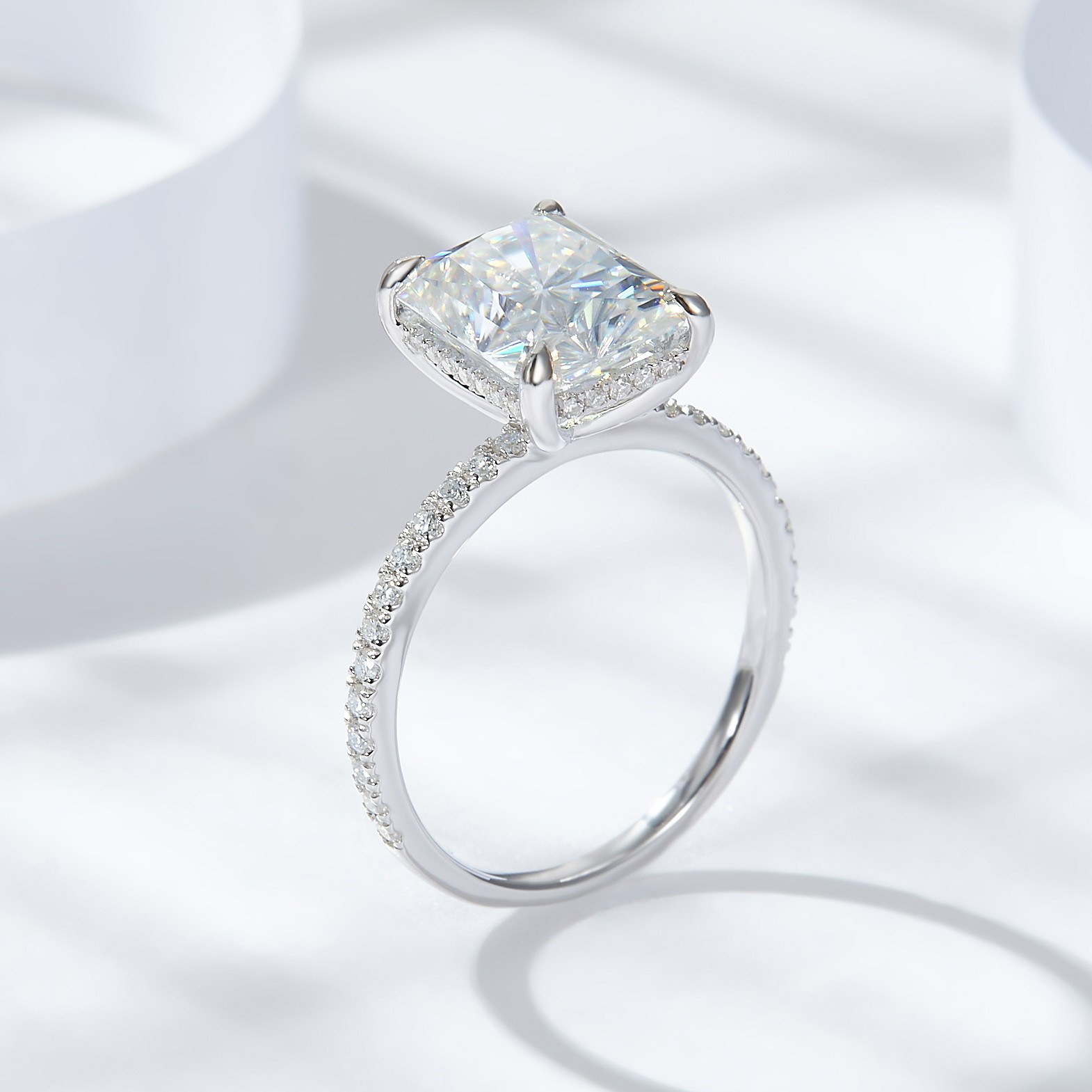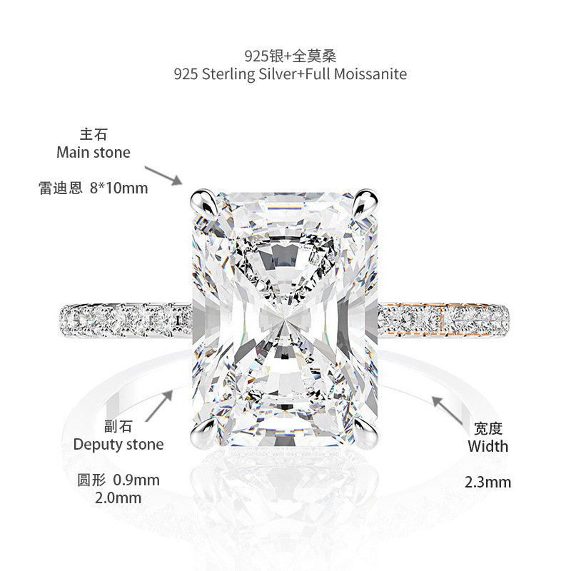 Experience the ultimate sparkle with our 4 Carat 8*10 Radiant Enche Radiant 925 Silver Moissanite Ring. Crafted with precision, this ring features a radiant cut stone that boasts a carat weight of 4. Its 925 silver band adds elegance and durability. Elevate your style with this stunning piece.