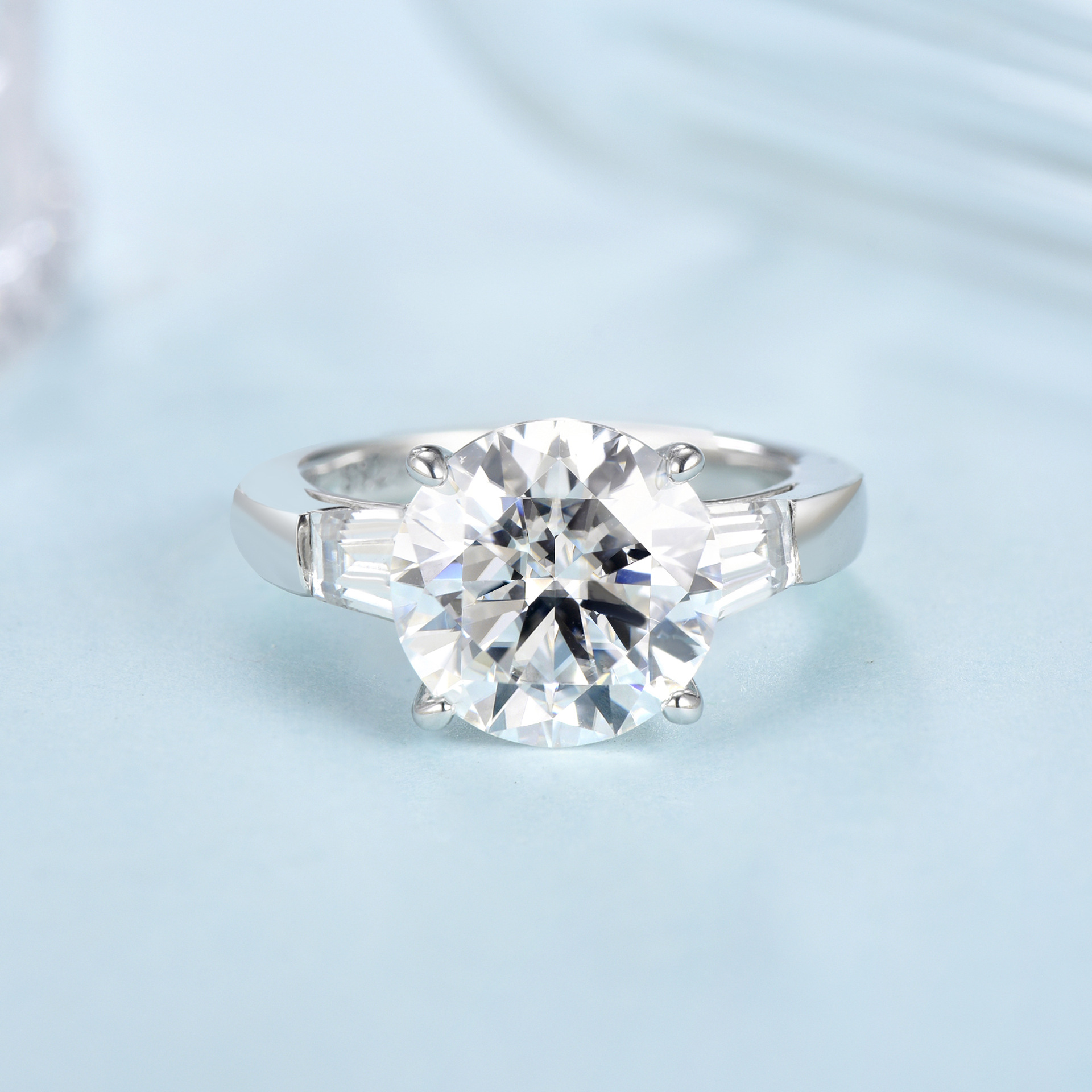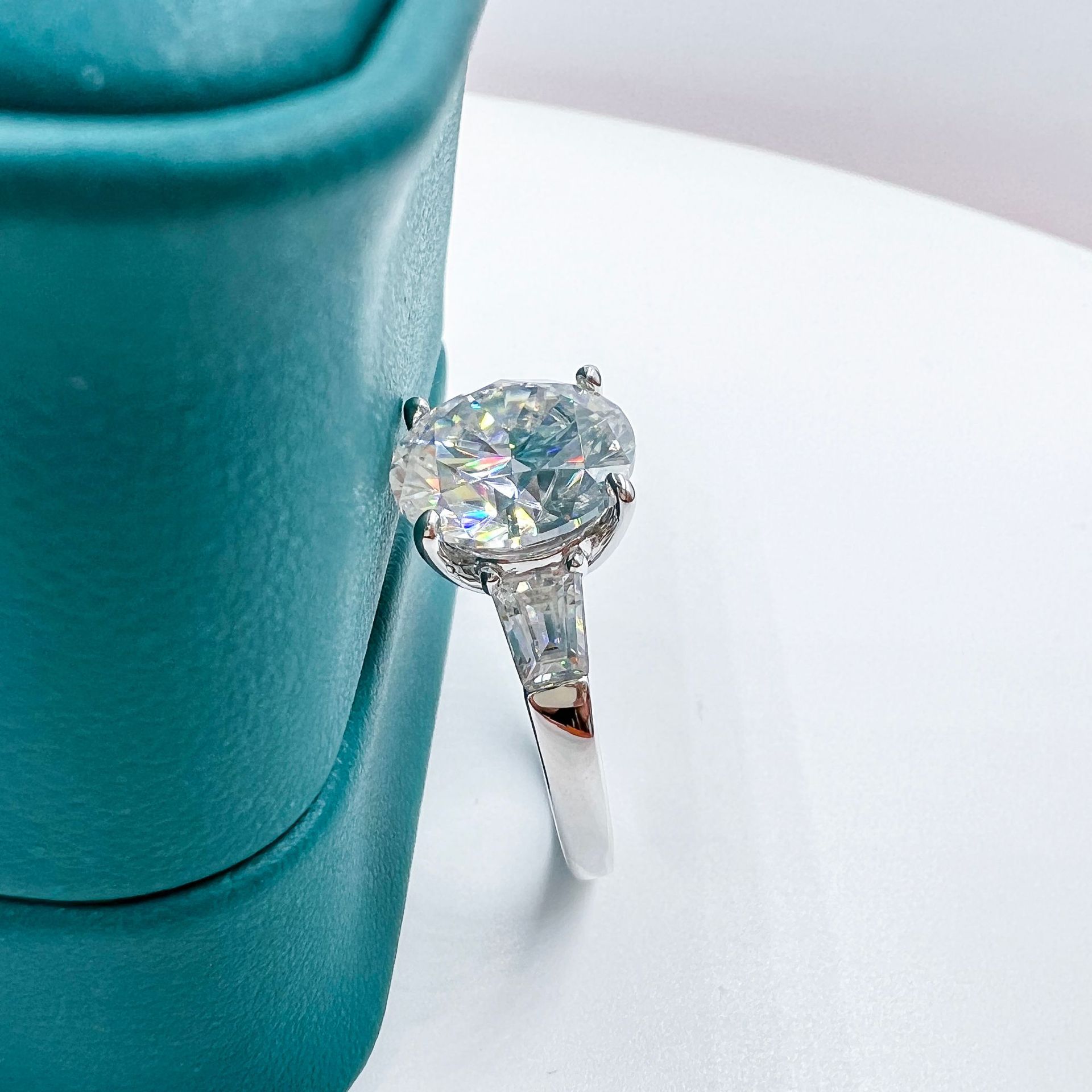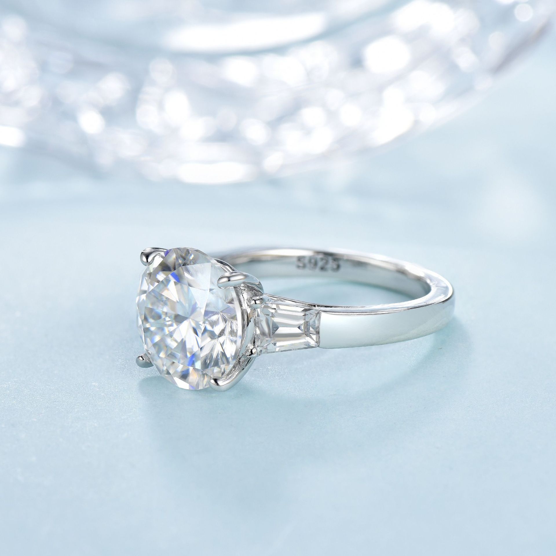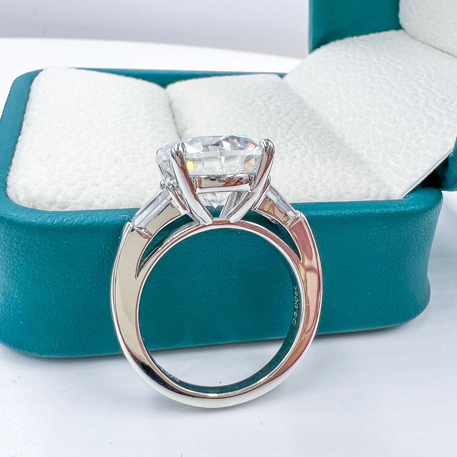 "This exquisite engagement ring features a 5 carat moissanite center stone, intricately cut and set in a pigeon egg shape. The silver plated S925 band is plated in 18k gold and adorned with sparkling diamonds for an elegant and luxurious touch. Make a lasting impression with this stunning and unique ring."
