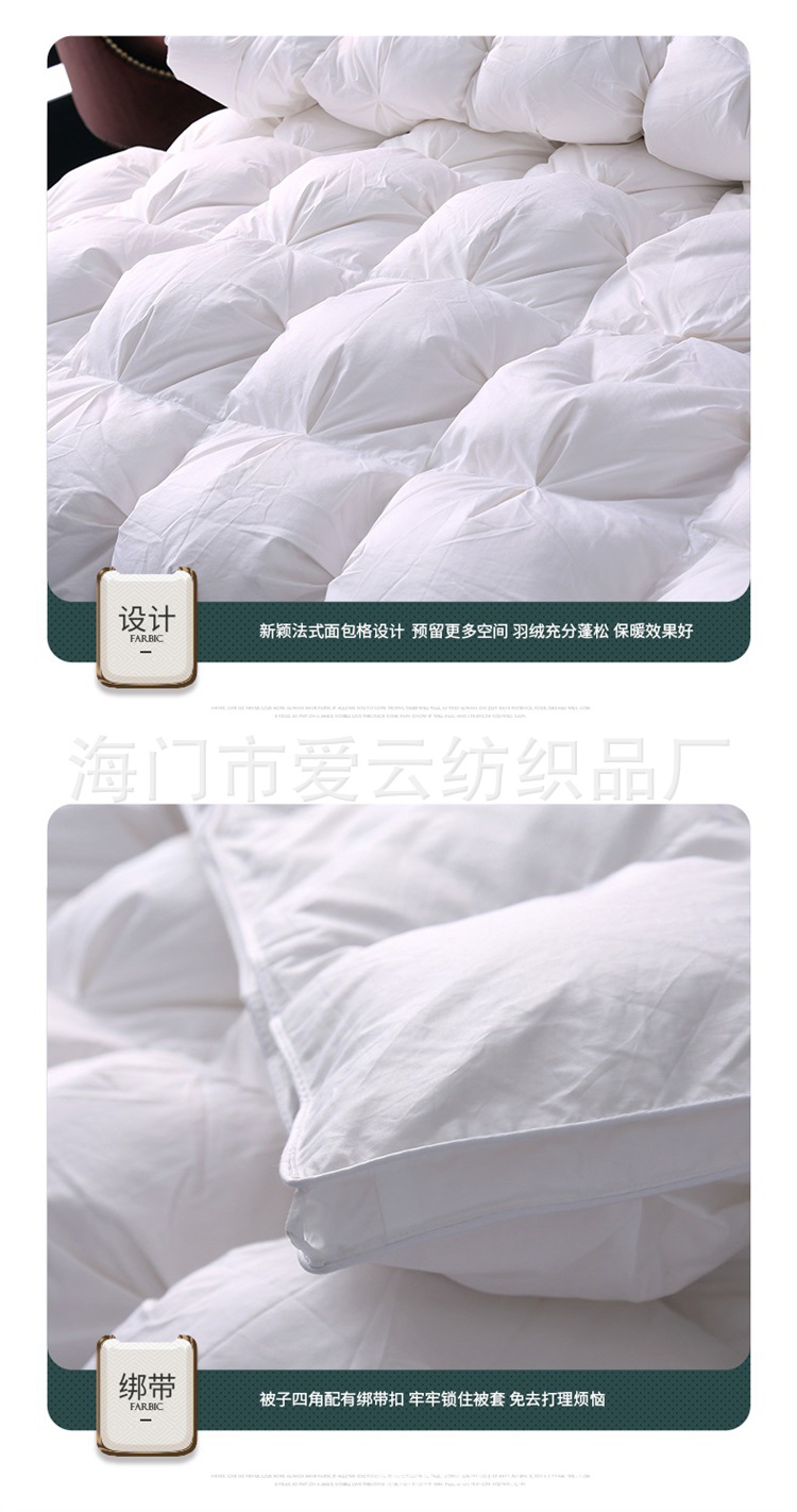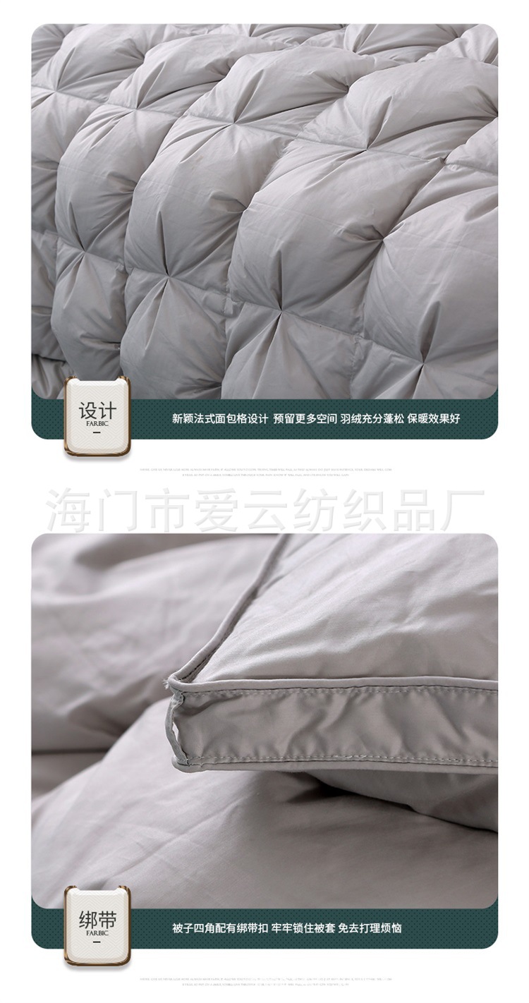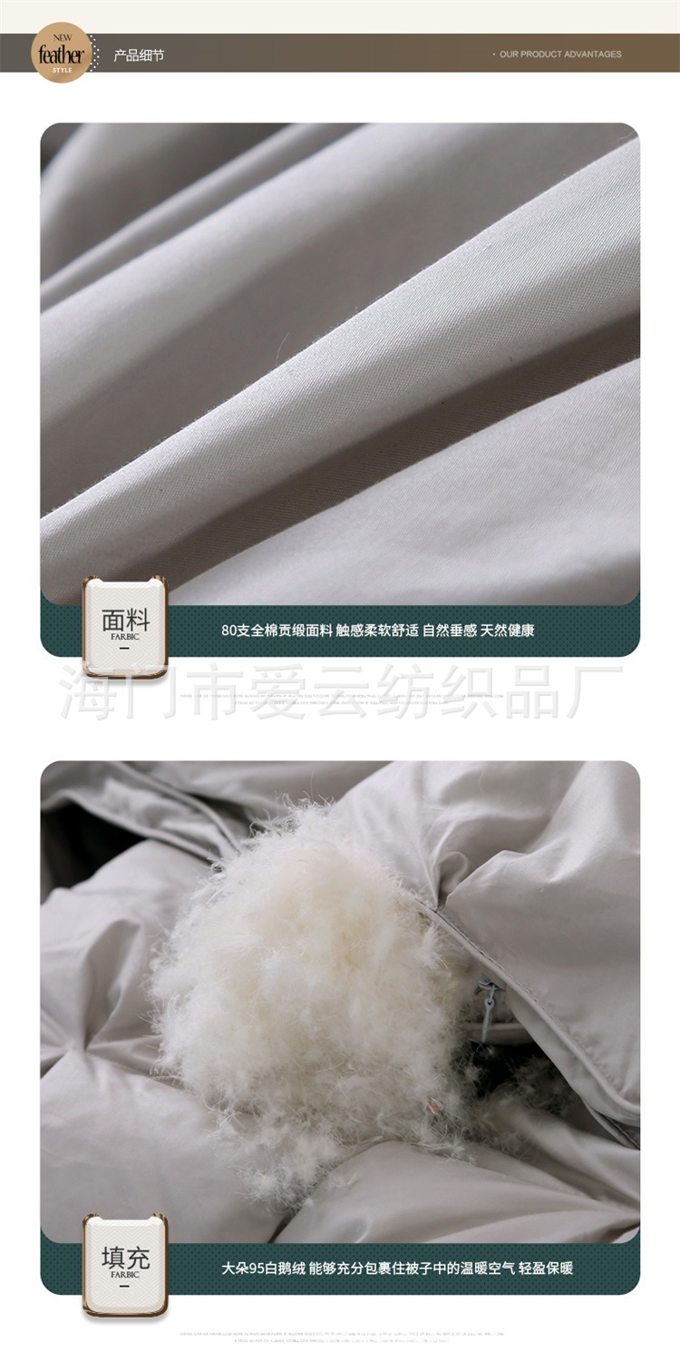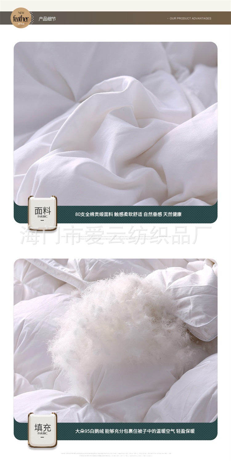 Filled with white goose down (up to 95%), 800+ bulkiness, 1000+ cleanliness, no peculiar smell, and will never drop down.