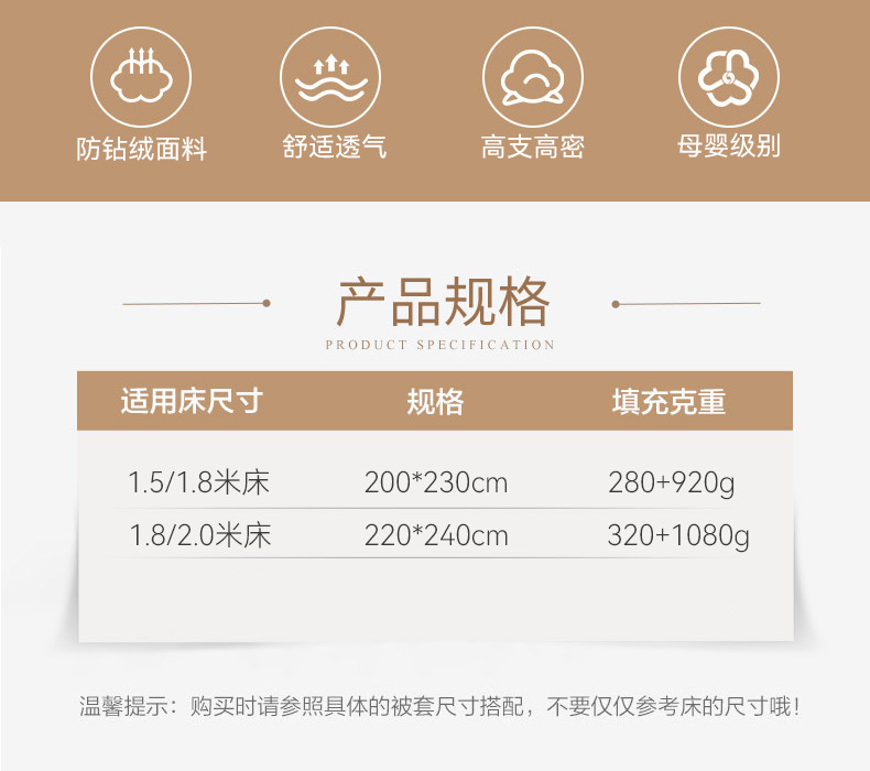 Size specifications: 200*230cm (filling 280g+920g), 220*240cm (filling 320g+1080g)