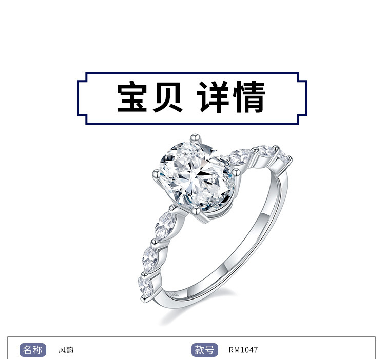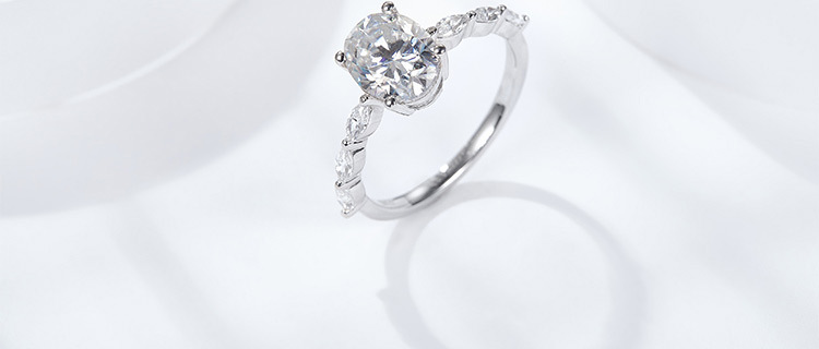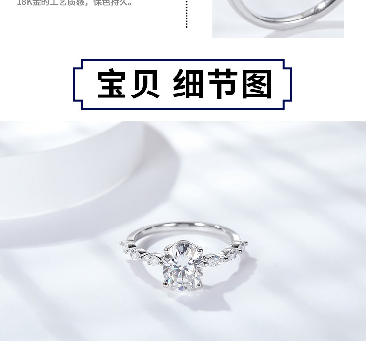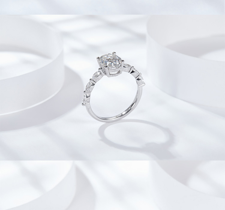 This stunning ring features a classic four-prong inlaid design, showcasing an oval moissanite, marquise, and olive-shaped stones. These precious gems add sparkle and dimension to the elegant design. Crafted with expert precision, this ring is sure to become a treasured heirloom.