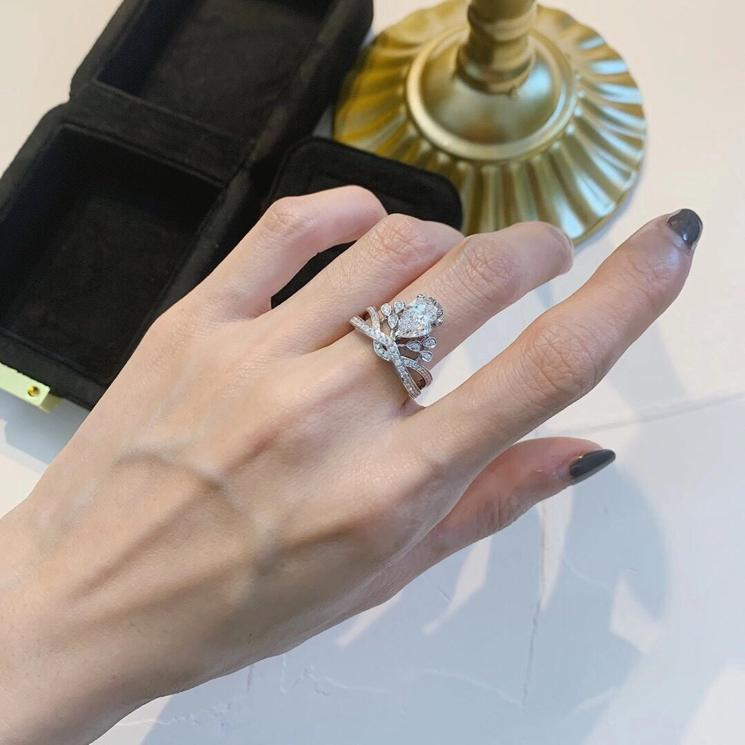 Experience royalty with this stunning Wish Cross Border Coronation Egret Feather Drop Pear Moissanite Emerald Red Sapphire Crown Ring. Crafted with exquisite attention to detail, this ring features a pear-shaped moissanite stone, emerald and red sapphire accents, and a unique egret feather design. Elevate your style and indulge in luxurious elegance.