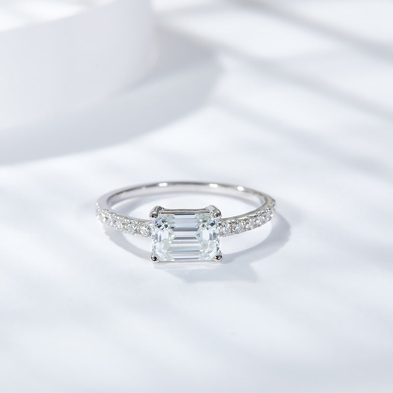 Experience the beauty and brilliance of an emerald-cut 5*7mm full moissanite stone in this exquisite silver plated 18k gold ring. This unique combination of materials creates a stunning piece that radiates luxury and sophistication. Elevate your style and make a statement with this timeless and elegant ring.
