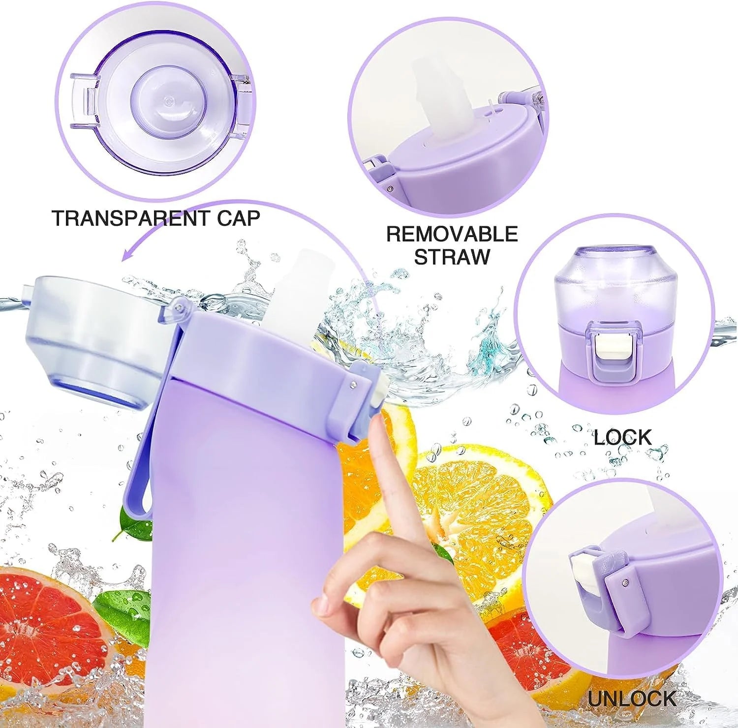 [VARIOUS FUNCTIONS AND WIDE RANGE OF USE]: Flavor Pod sports water bottle is a novel sports water bottle that has a lot of improvements over the traditional water bottle. The bottle features a silicone handle, which makes it easier to carry; a large capacity of 650ml; a key with a locking ring for opening; a straw built in to prevent choking on water; and a large diameter bottle mouth that makes it easier to fill and clean. The product can be used indoors and outdoors, for example, in the home, office, gym, on hikes, in camping, in travel, etc.