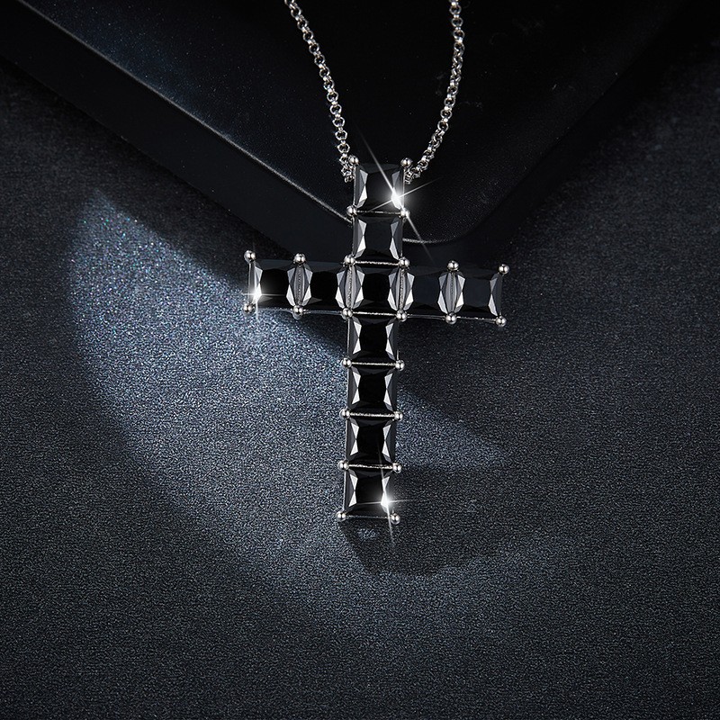Make a statement with our hip-hop cross necklace. Featuring a black 5.5mm princess square moissanite, this necklace is inlaid with silver and plated with 18k gold. Enjoy the perfect combination of style and luxury while making a bold fashion statement.