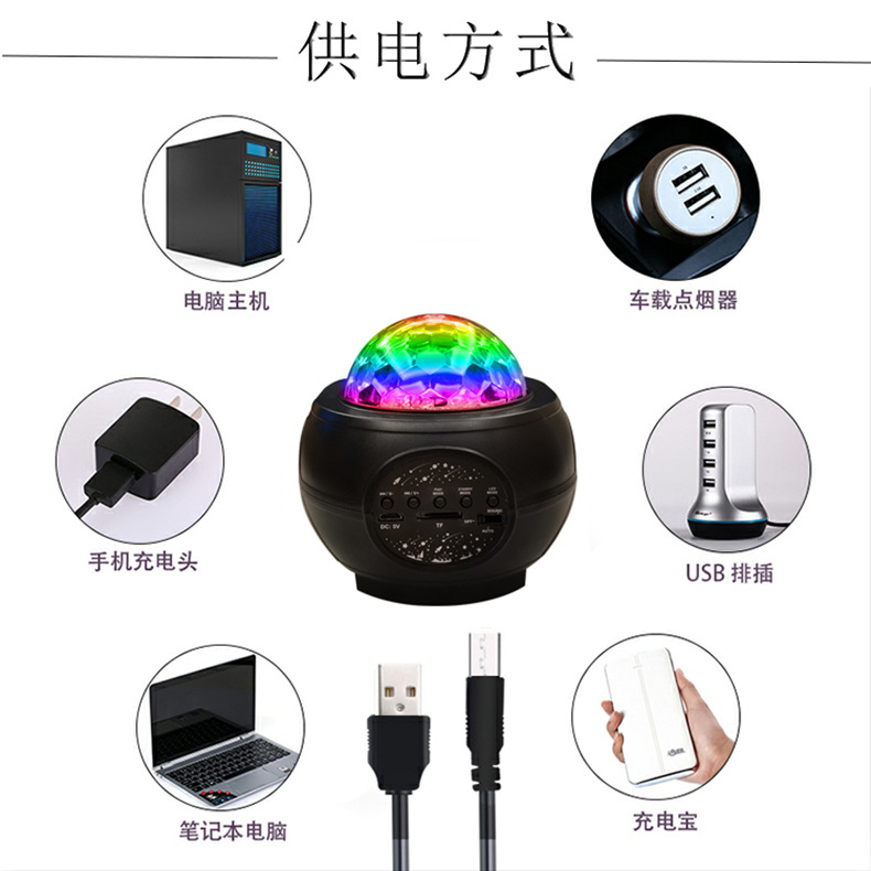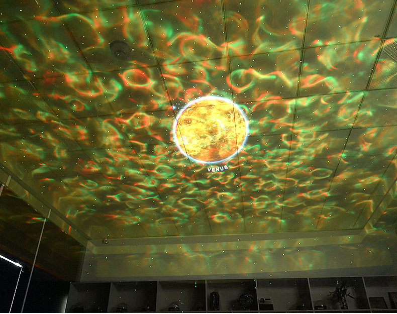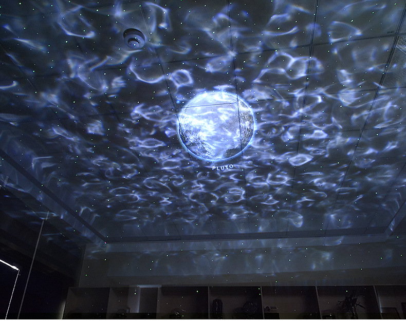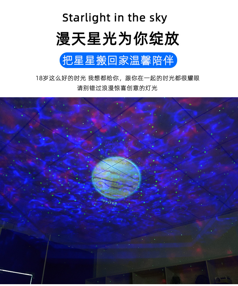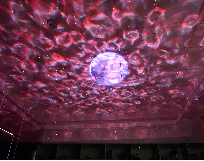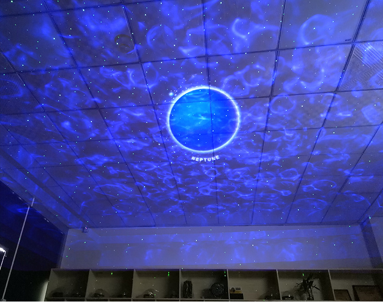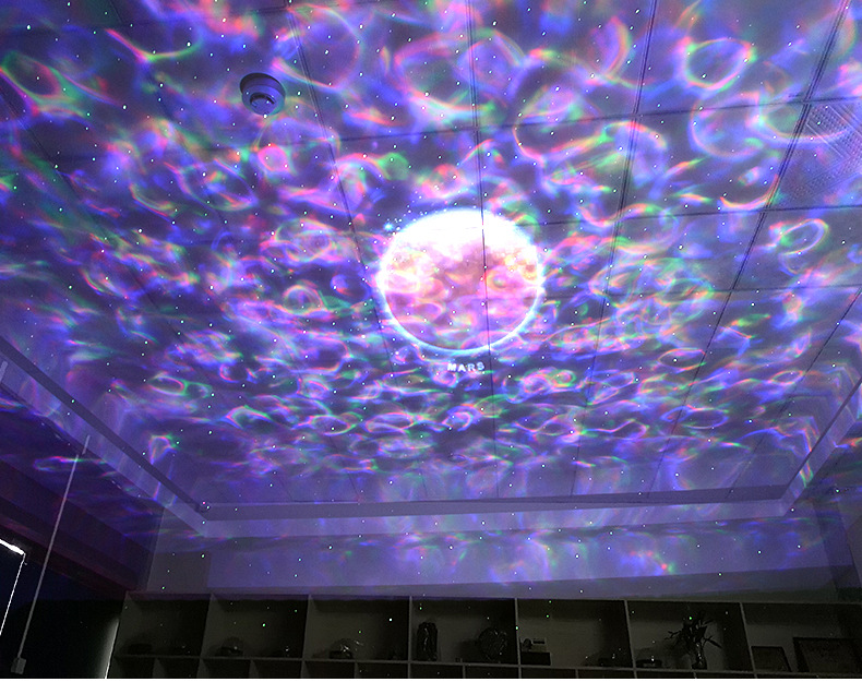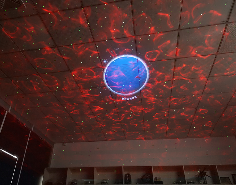 Star Light Projector belongs to the combination of four-color water grain Lamp + Green Laser + 10 planet patterns. The water grain has four basic colors of red, white, blue and green, which can be randomly combined with 15 colors. The color of laser is green, and the planet has 10 patterns.