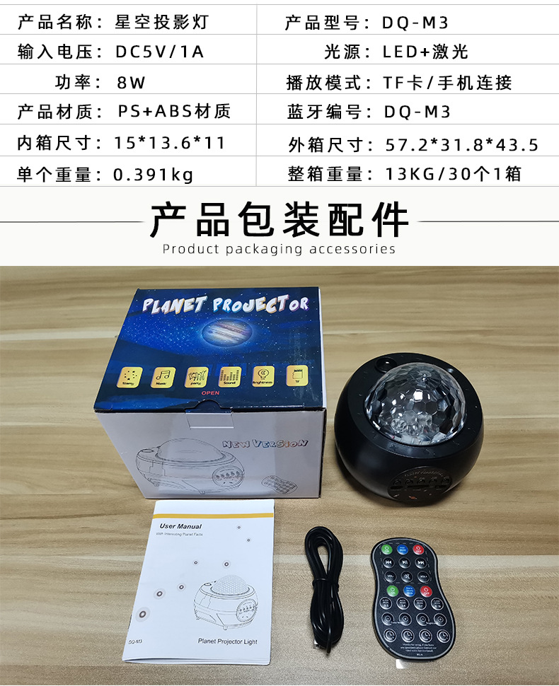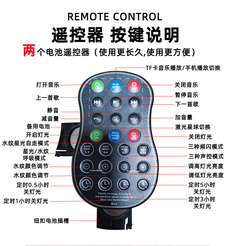 Remote control functions: laser brightness, water pattern, Bluetooth pattern, water pattern single control, laser single control, planet single control, voice control, timing, switch