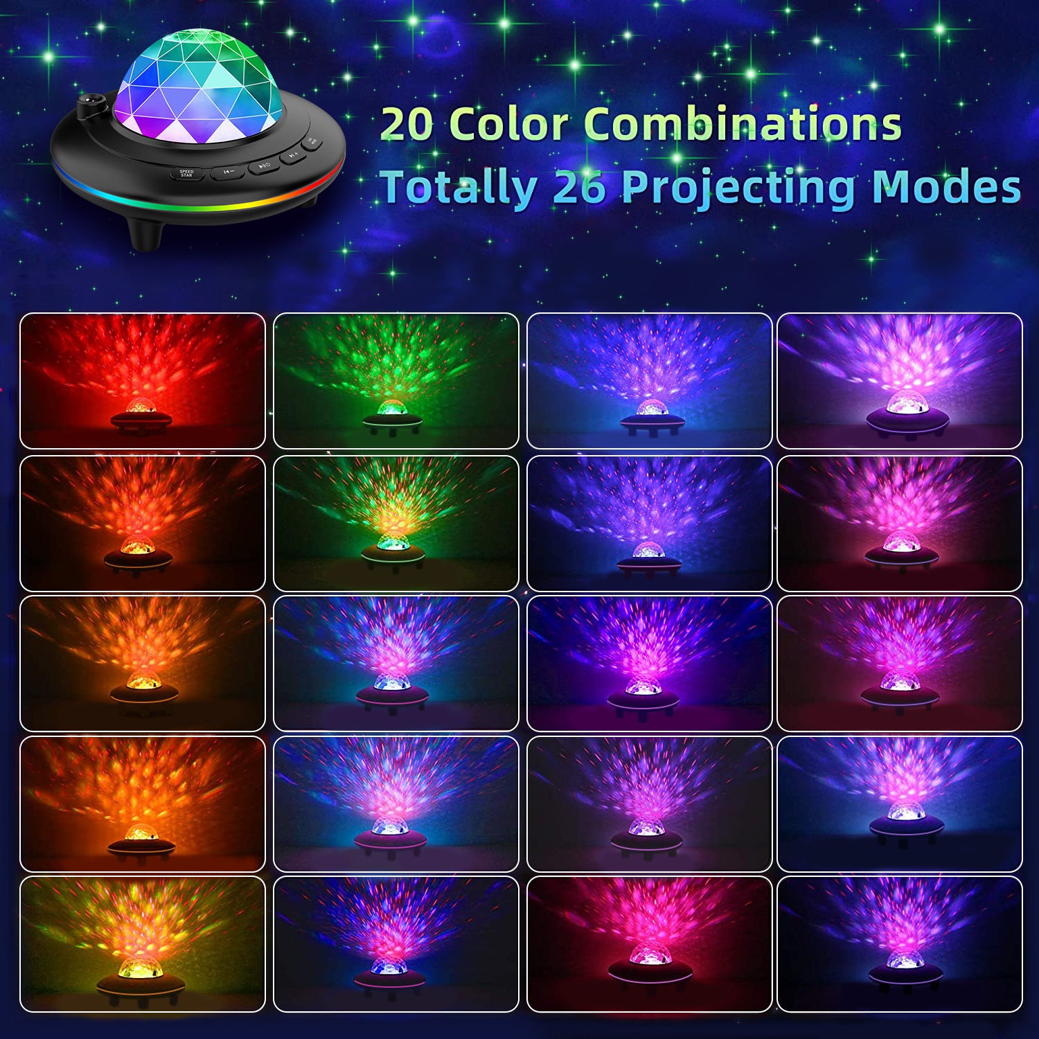 Functions: Blinking stars,Nebula cloud,LED colourful lights,Time function,Bluetooth Wireless speaker,Remote control