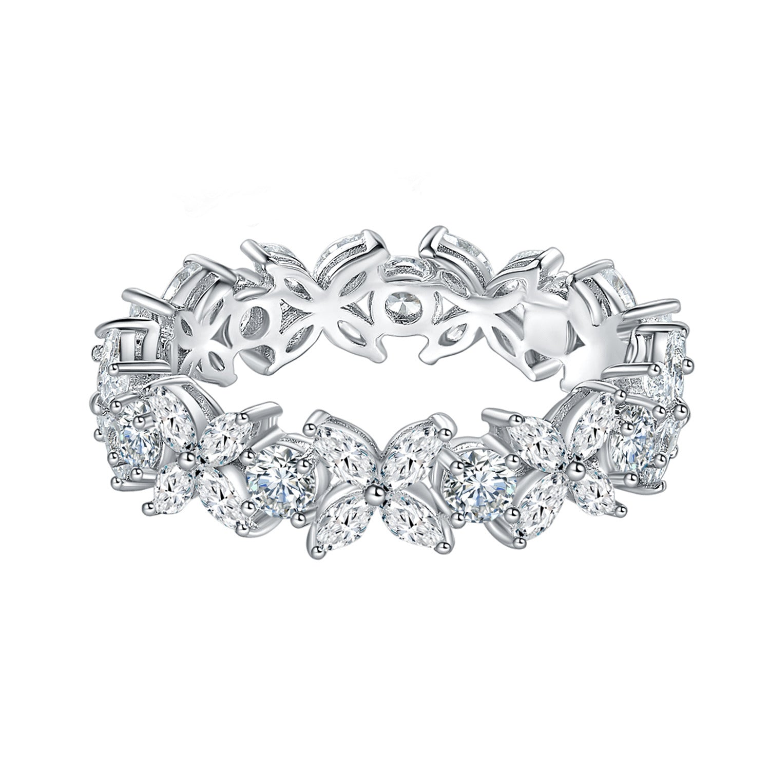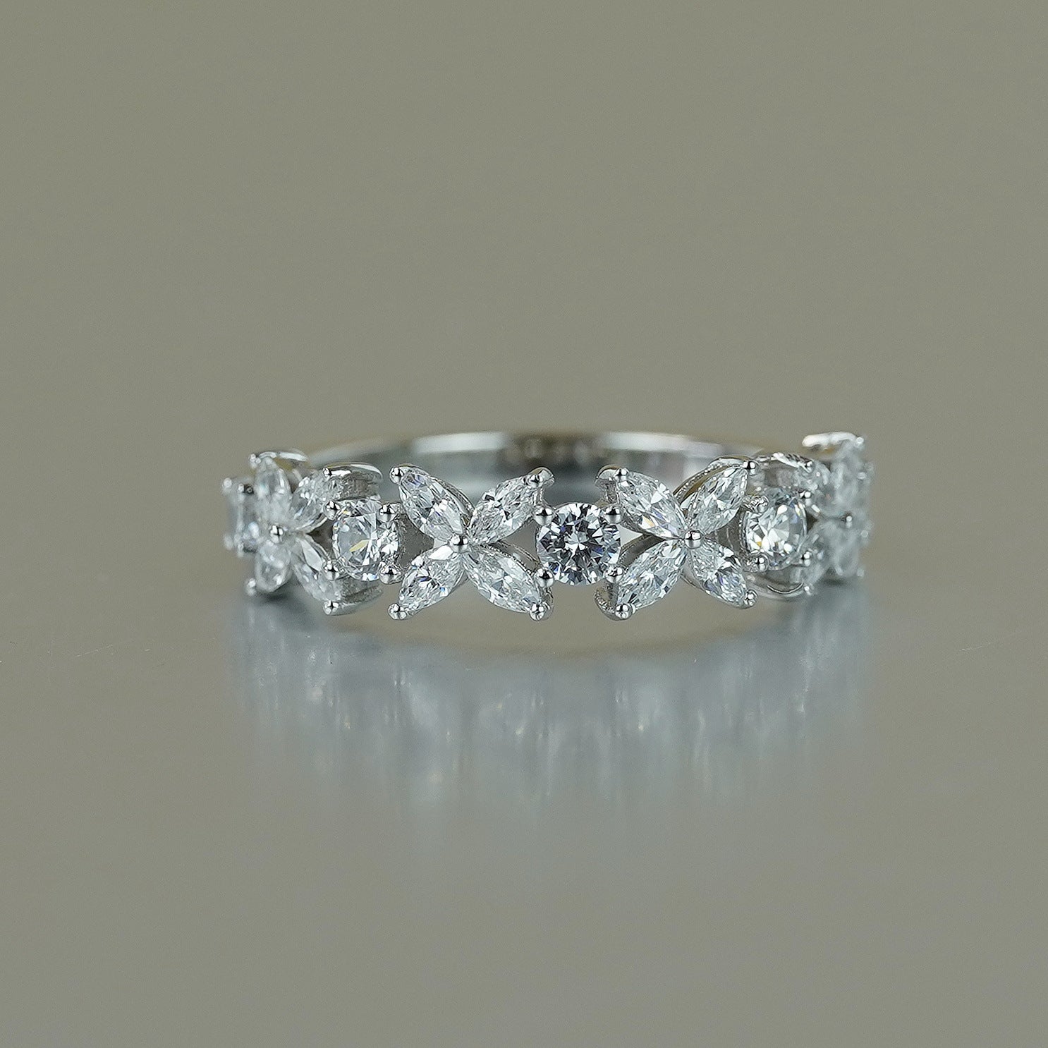 Experience the elegance and versatility of our Marquise Moissan, Lucky Clover Diamond Ring. Crafted with a silver plated 18K white gold band, it features a half diamond row and a unique lucky clover design. Perfect for any occasion, this ring will add a touch of sophistication to any outfit.
