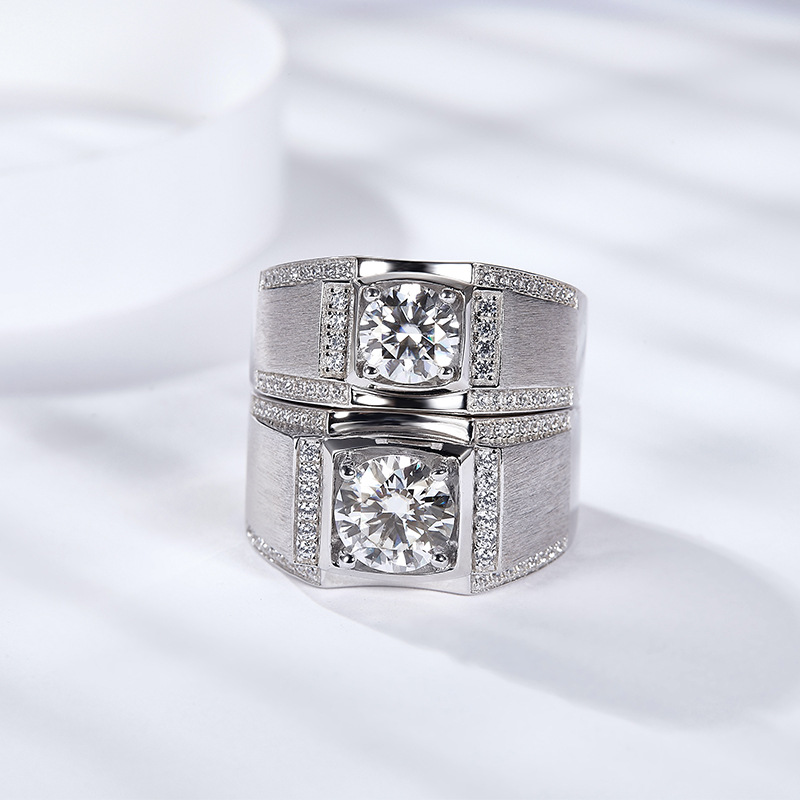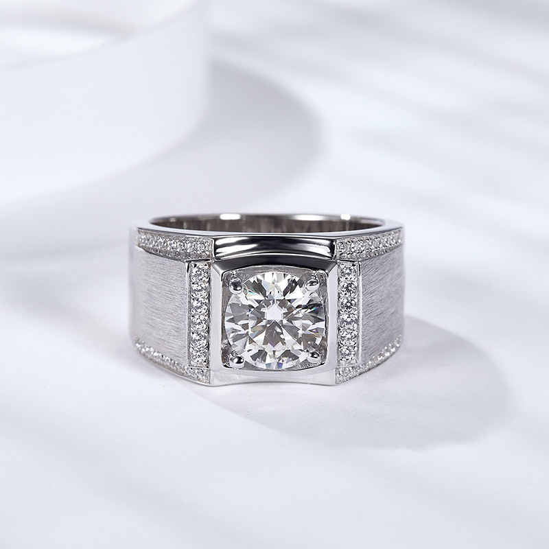 Crafted with a silver plated 18K white gold brushed band, this stunning men's ring features a brilliant 1 carat Moissanite diamond. Perfect for weddings or as a statement piece, this ring exudes elegance and luxury. Enhance your style with this timeless and unique Moissanite ring.