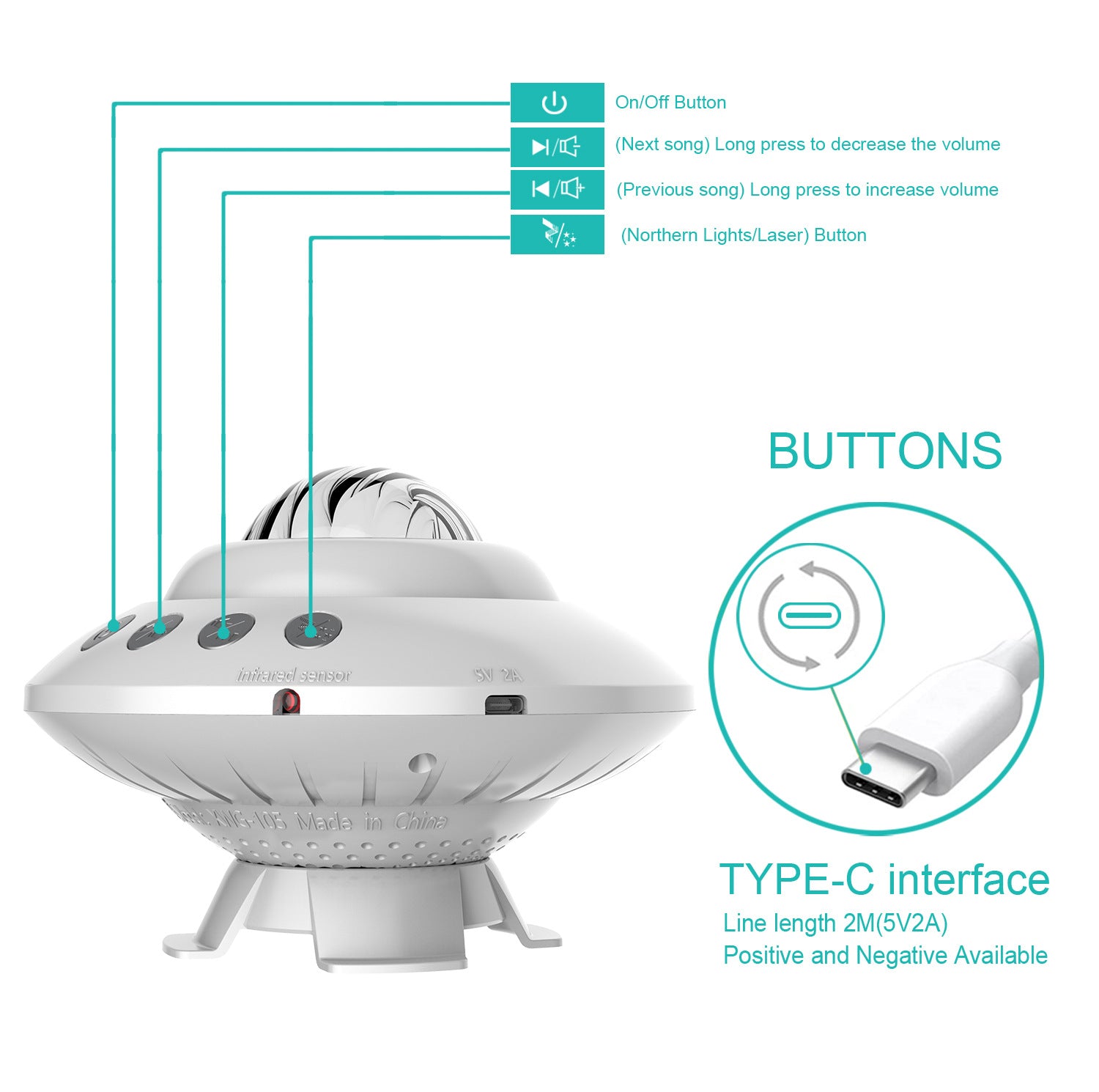 This galaxy projector has a UFO shape with an adjustable base that rotates 270 degrees. It can be switched between aurora and star projection modes or both simultaneously. This UFO starry projector transforms the ceiling into a home planetarium, allowing children to explore the mysteries of the starry sky and inspire their curiosity, imagination, and creativity. Adults can also fulfill their fantasy of space.