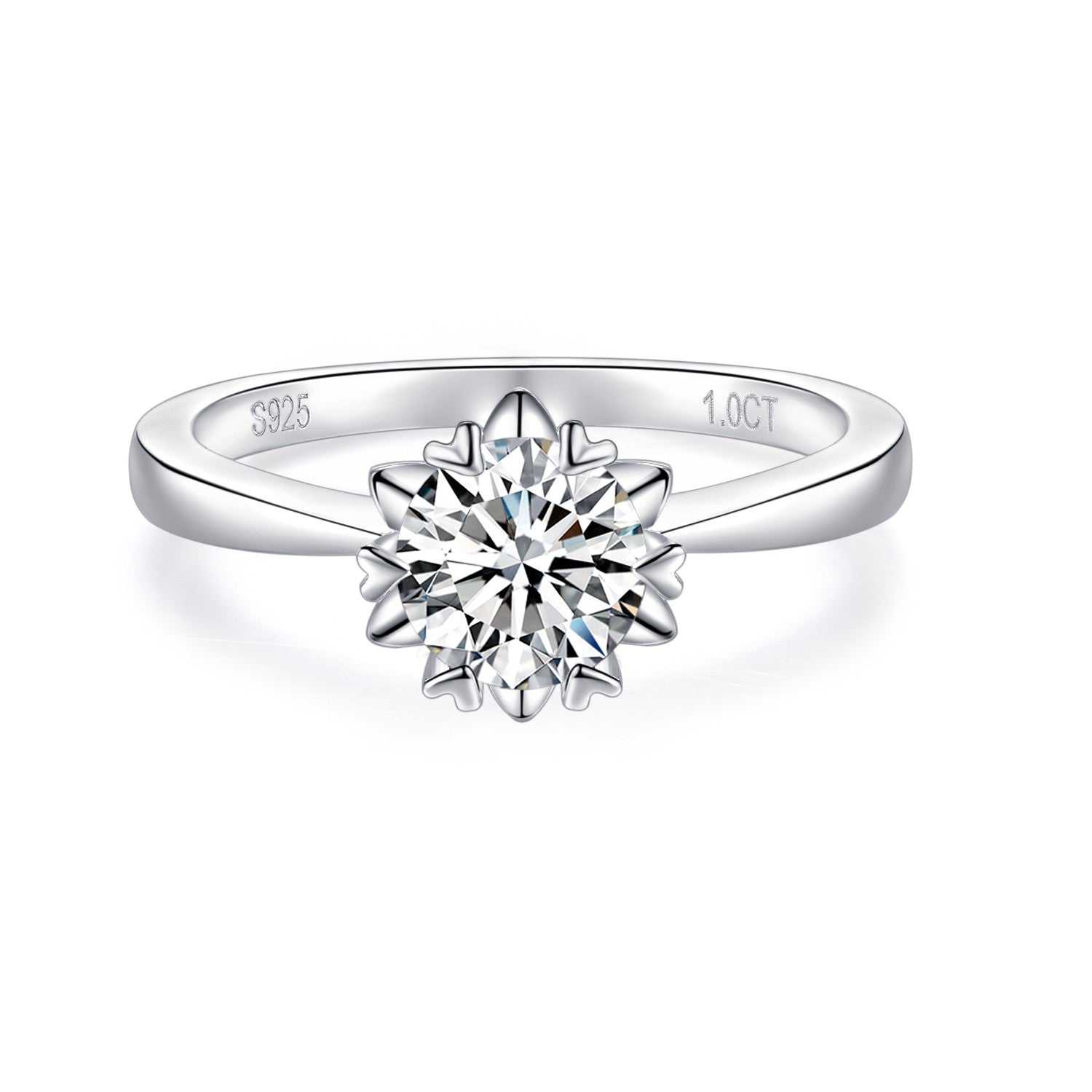 Enhance your style with our Straight Arm Classic Snowflake ring, featuring a 1 carat D-grade white Moissanite stone set in S925 silver plated with white gold. The timeless snowflake design adds a touch of elegance, making it a perfect accessory for any occasion.