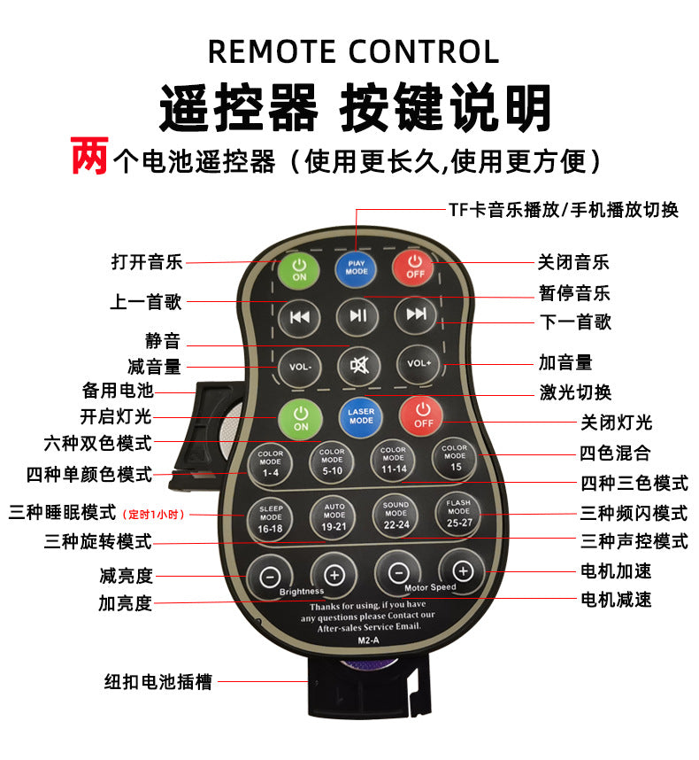 Music play, LED background colors, Starry/Galaxy, brightness control, ocean wave changes speed, and lamp on/off can all be controlled with the remote. Sound-activated mode allows the projection to flash or change color based on the beat of the music or the clapping of the hands. The remote comes with a stand-by battery, so when the working battery runs out, just replace it with the spare.